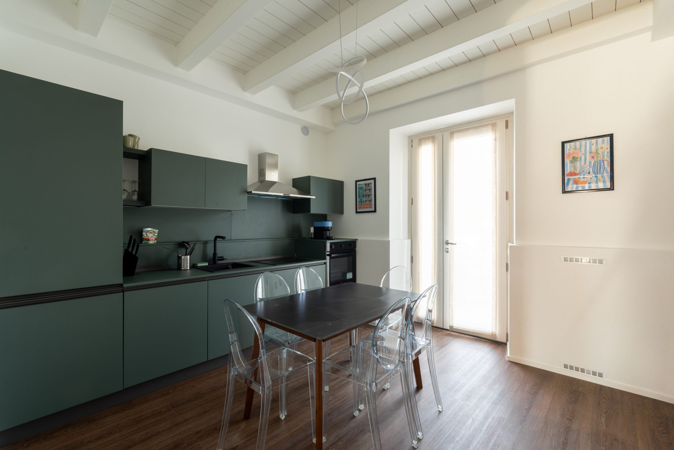 Al piano terra si trovano il soggiorno, dotato di divano letto e TV, e una cucina abitabile su misura realizzata con materiali premium, oltre a un bagno di servizio. La zona giorno è impreziosita da una scala artigianale che conduce al piano superiore, illuminata da un lampadario fatto a mano che aggiunge un tocco di eleganza distintiva.