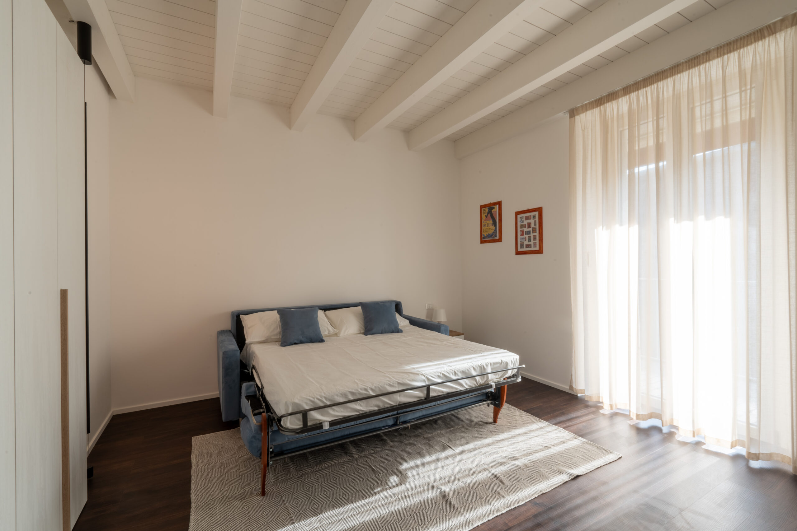 Il fiore all’occhiello è l’ampio balcone abitabile, spazio ideale per momenti di relax, colazioni all’aperto o aperitivi al tramonto. La tenda elettrica con sensori meteo garantisce protezione e comfort automatici in ogni condizione atmosferica.