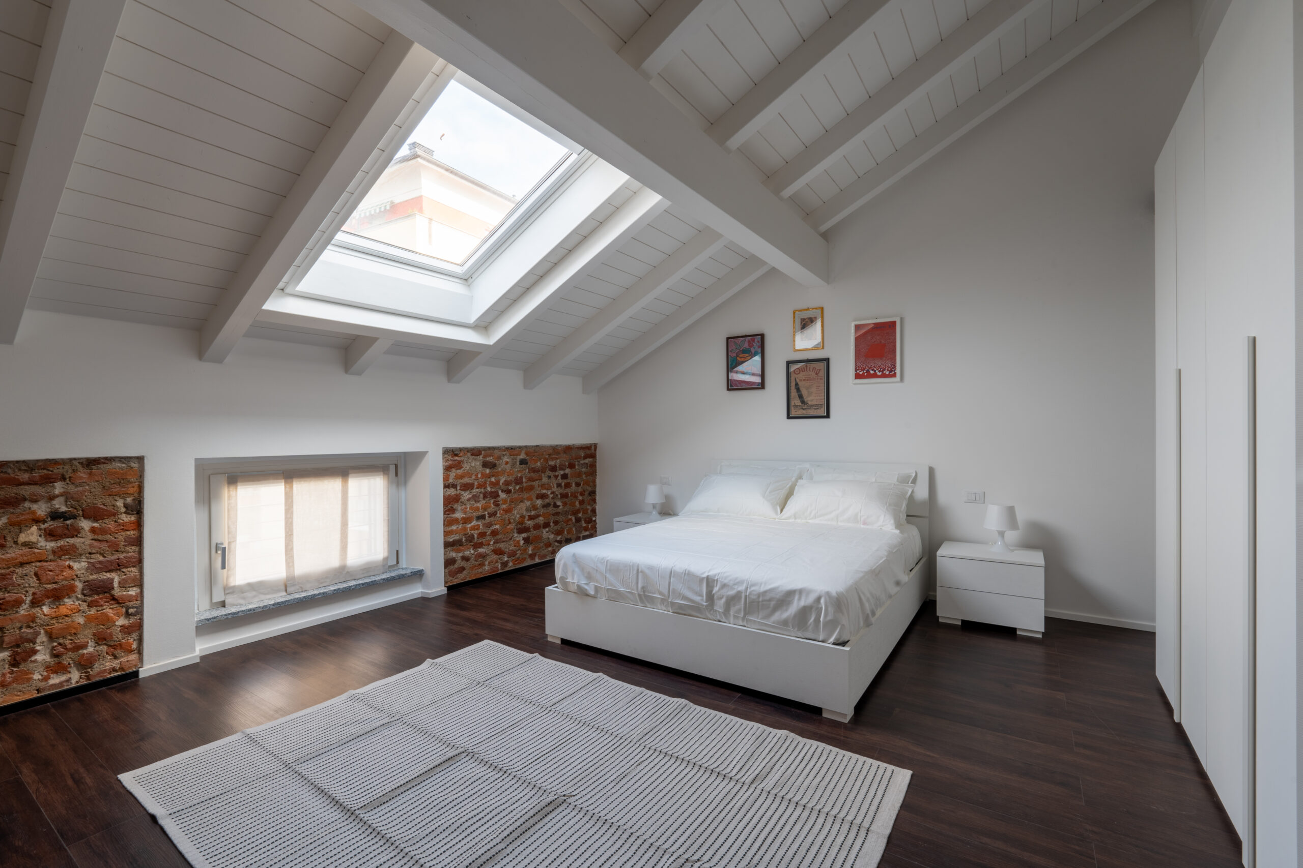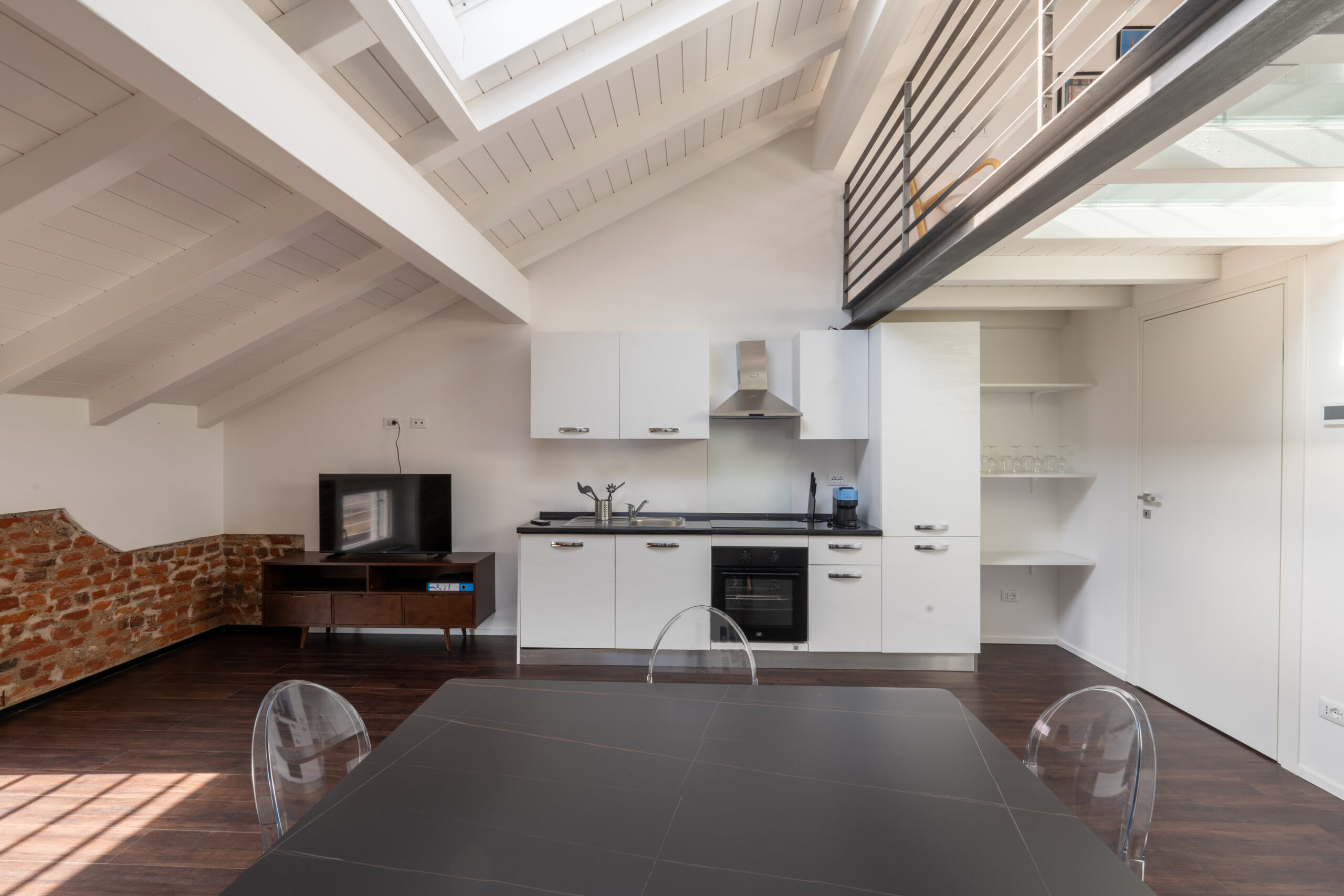 Accogliente bilocale nel sottotetto con soppalco in legno e travi a vista. La camera matrimoniale è spaziosa e luminosa grazie alle finestre Velux con apertura elettrica.