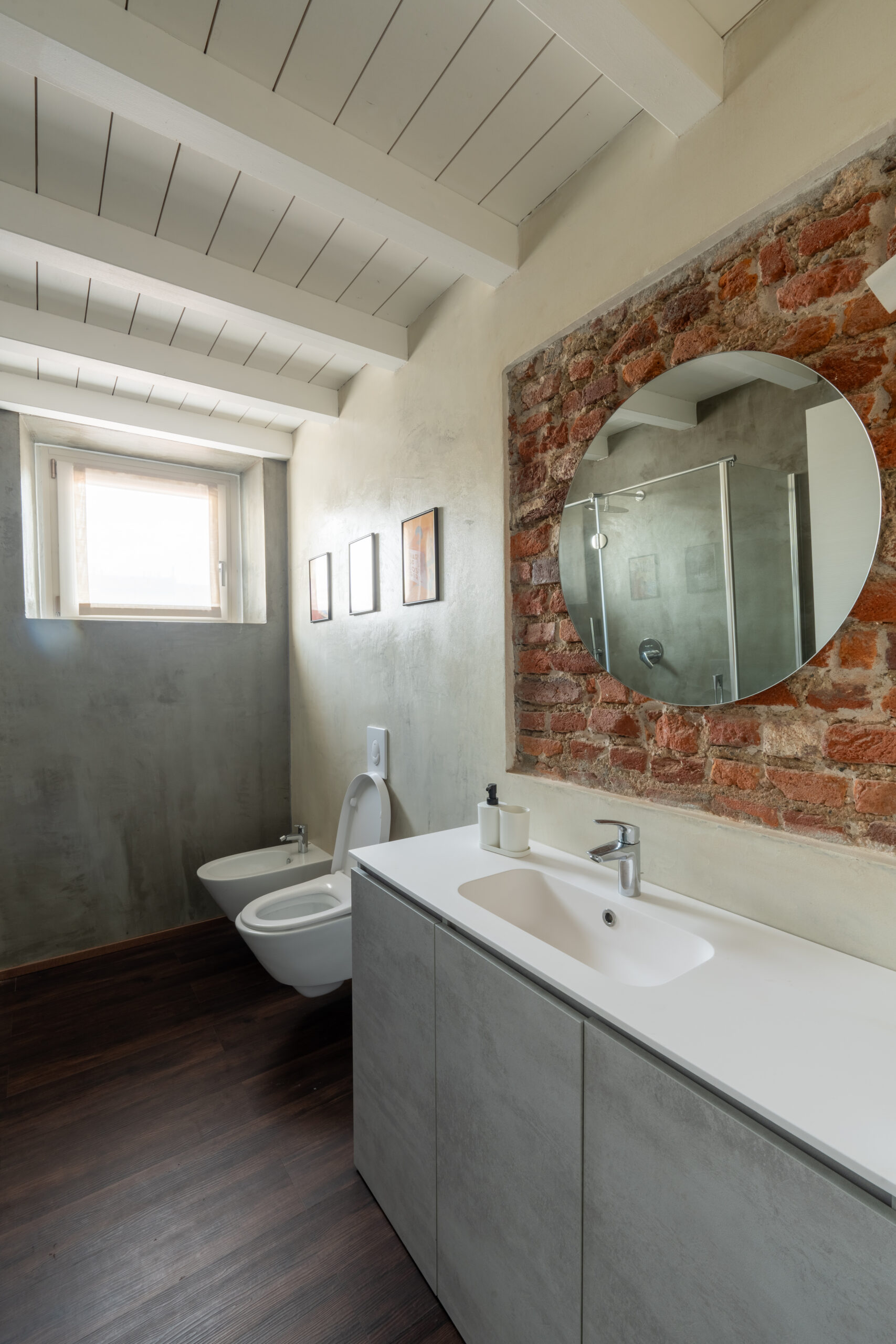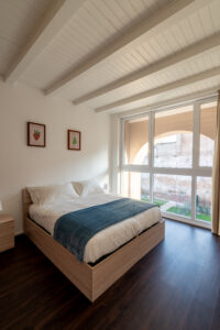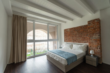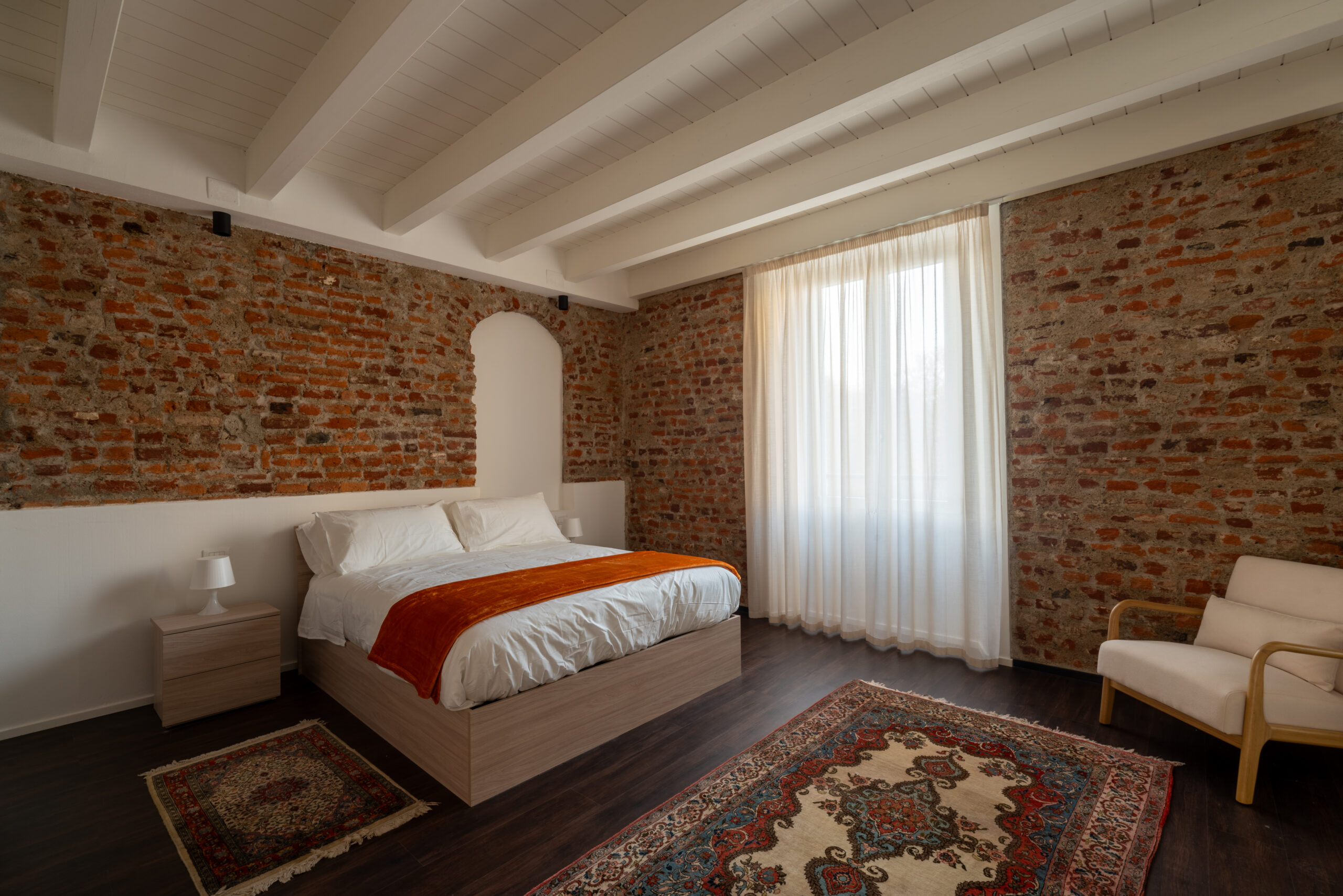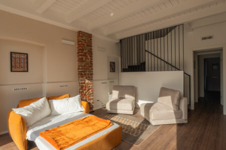 Appartamenti di carattere, dove ampiezza e luminosità si fondono con dettagli architettonici di pregio. La camera matrimoniale, arricchita da una suggestiva nicchia e murature a vista, dialoga con il primo bagno impreziosito da un’ampia doccia walk-in incorniciata da pietra originale.