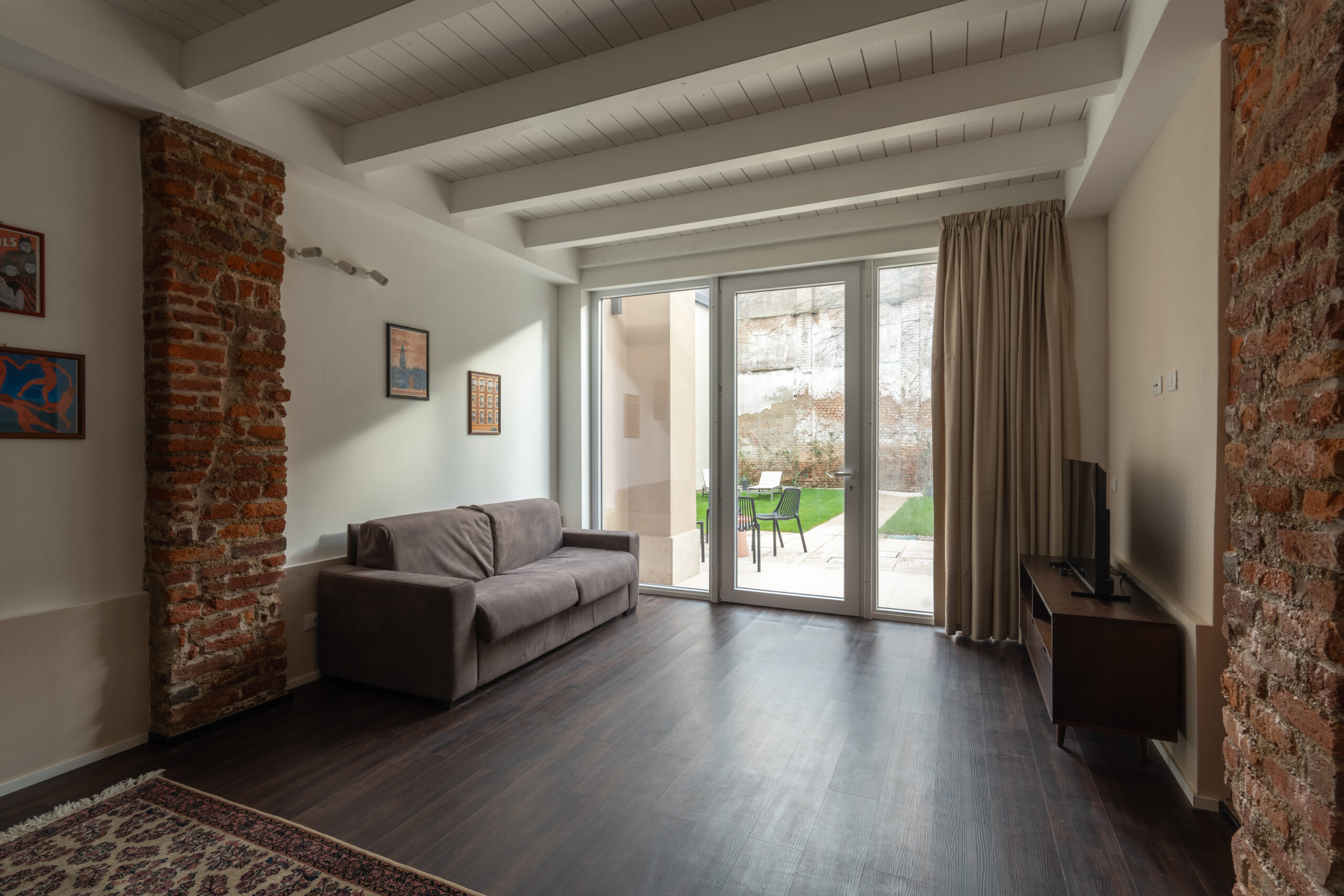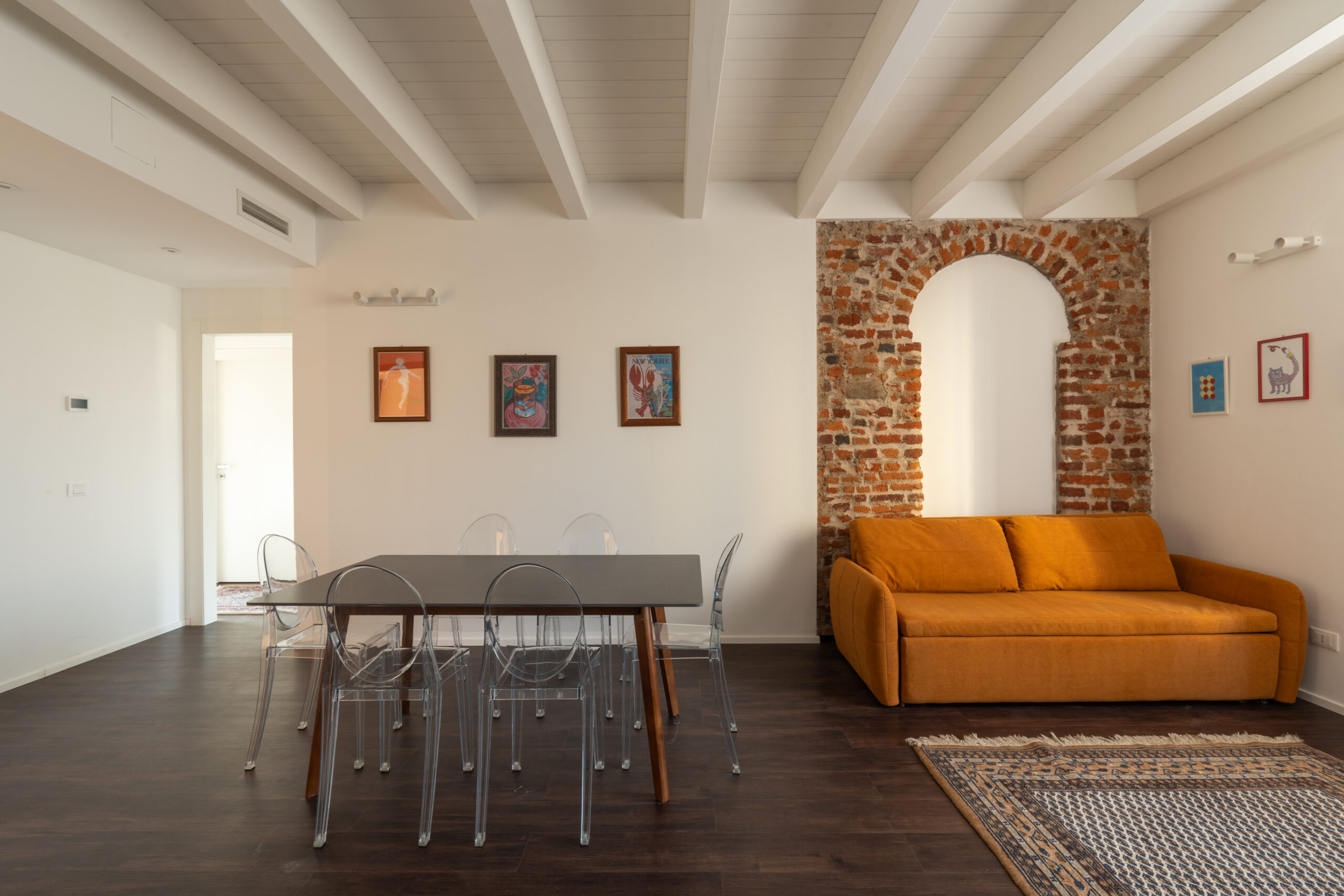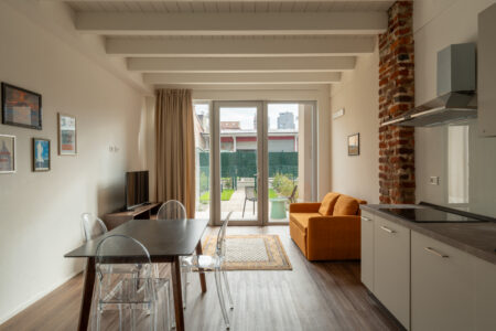 Accogliente e raffinato, questo bilocale è ideale per un soggiorno confortevole a Milano. L’accesso dal giardino privato, attraverso una splendida volta, introduce alla zona giorno con cucina su misura e divano trasformabile in letto, perfetto per ospiti extra.