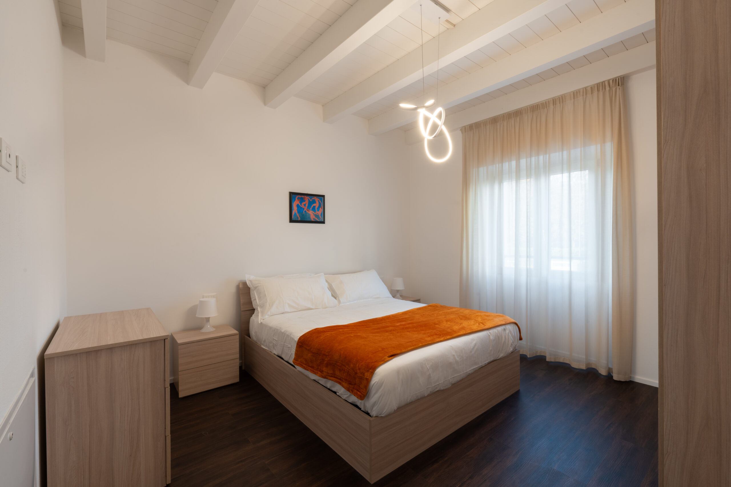 La camera matrimoniale è ampia e comoda, mentre il bagno completo con doccia e lava-asciuga garantisce praticità e comfort.