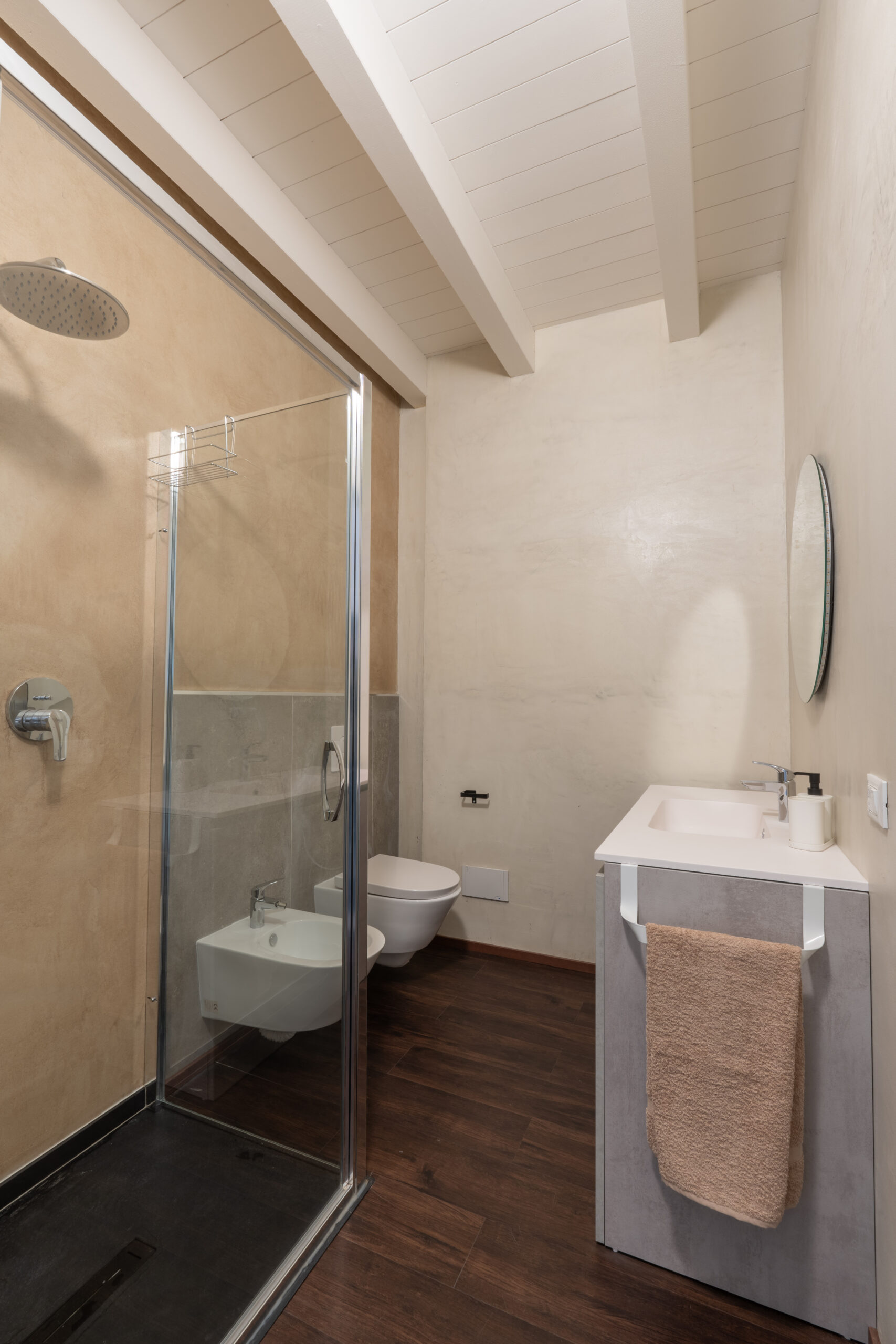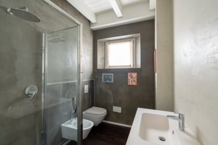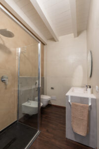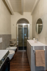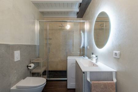 Il bagno è dotato di ampia cabina doccia e lavatrice. L’impianto di climatizzazione radiante a pavimento e la ventilazione meccanica controllata assicurano comfort costante ed efficienza energetica in ogni stagione.