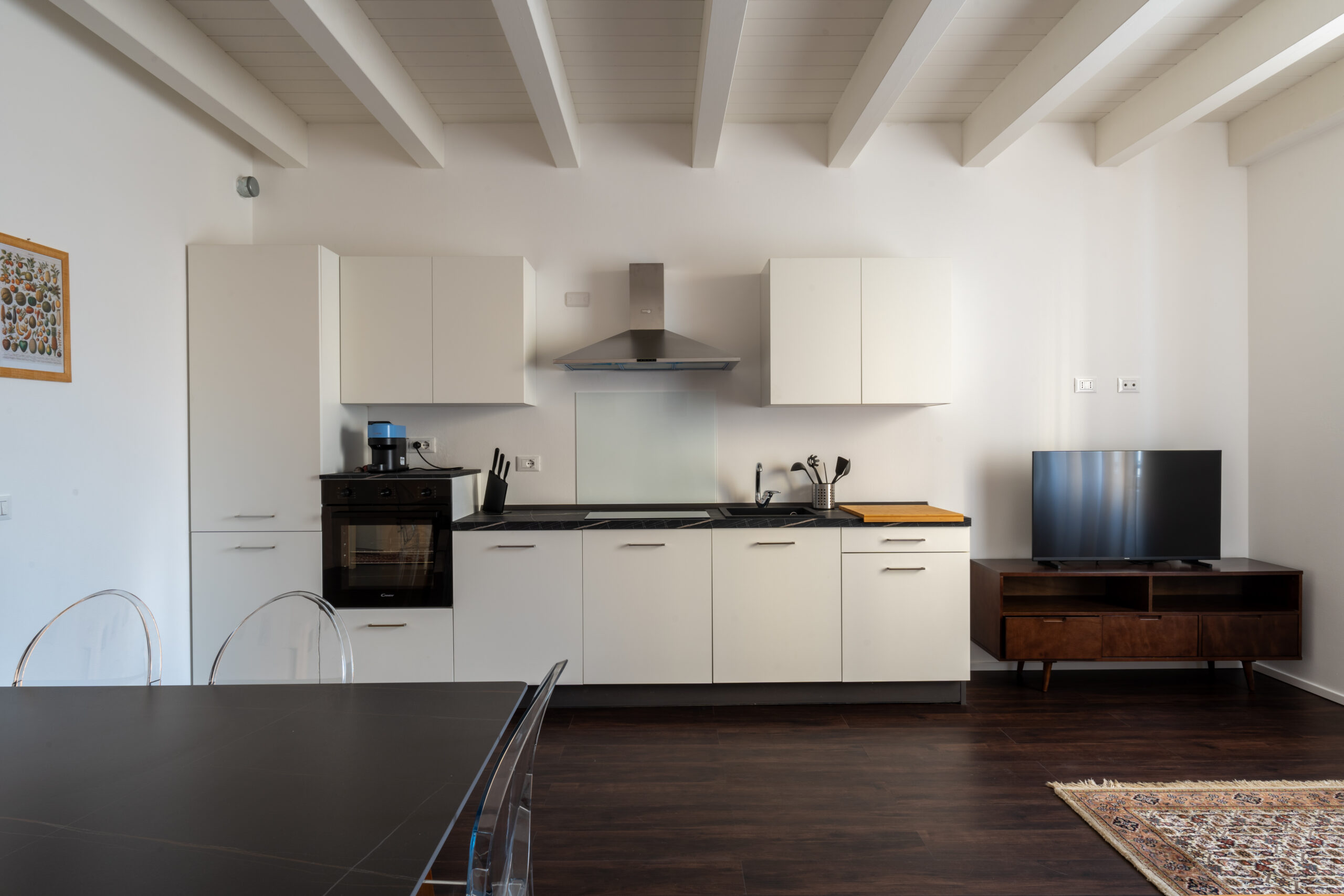 La cucina su misura, accoglie un grande tavolo per sei persone affacciato sul balcone. Il cuore dell’abitazione è il suggestivo ex fienile, spazio dall’alto soffitto con travi a vista illuminato da ampie finestre Velux a comando elettrico. Qui si sviluppa la scenografica zona living, impreziosita da due grandi vetrate scorrevoli che aprono su una splendida terrazza abitabile: ideale per pranzi all’aria aperta, momenti di relax o aperitivi.