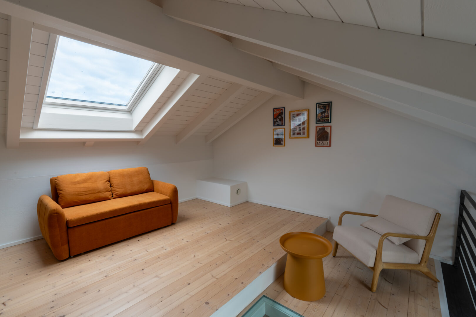 Una graziosa scala a pioli conduce al caratteristico soppalco, dove un secondo divano letto offre una soluzione versatile per un ospite o come angolo relax privato.