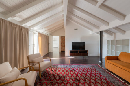 Il living ospita due divani letto, TV da 50 pollici e un’ampia libreria che cela, tramite porta a scomparsa, un generoso ripostiglio.